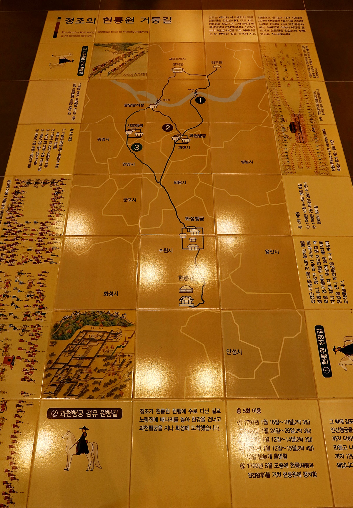 ② 과천행궁 경유 원행길 - 정조가 주로 이용한 길로 노량진에 배다리를 놓아 한강을 건너고 용양봉저정, 과천행궁을 지나 화성에 도착하였으며 5회 이용.