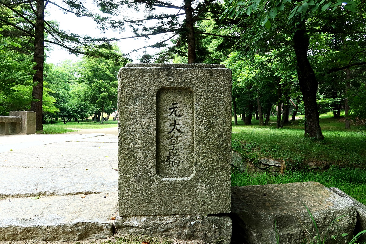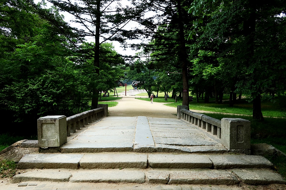 금천교 역할을 하는 자그마한 석교는 원래 수원비행장 남쪽의 황구지천에 있던 돌다리로서 1960년대까지 무너진채 남아 있었는데 1970년 비행장 확장공사 구간에 포함되어 일부 석재를 융릉 안으로 옮긴 역사가 있습니다.
