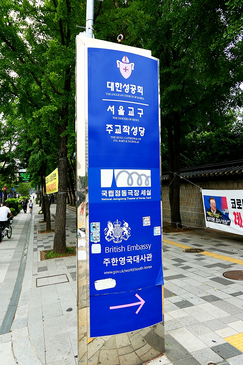 서울도시건축전시관을 나서면 대한성공회서울교구주교좌성당, 국립정동극장 세실, 주한영국대사관으로 가는 길.