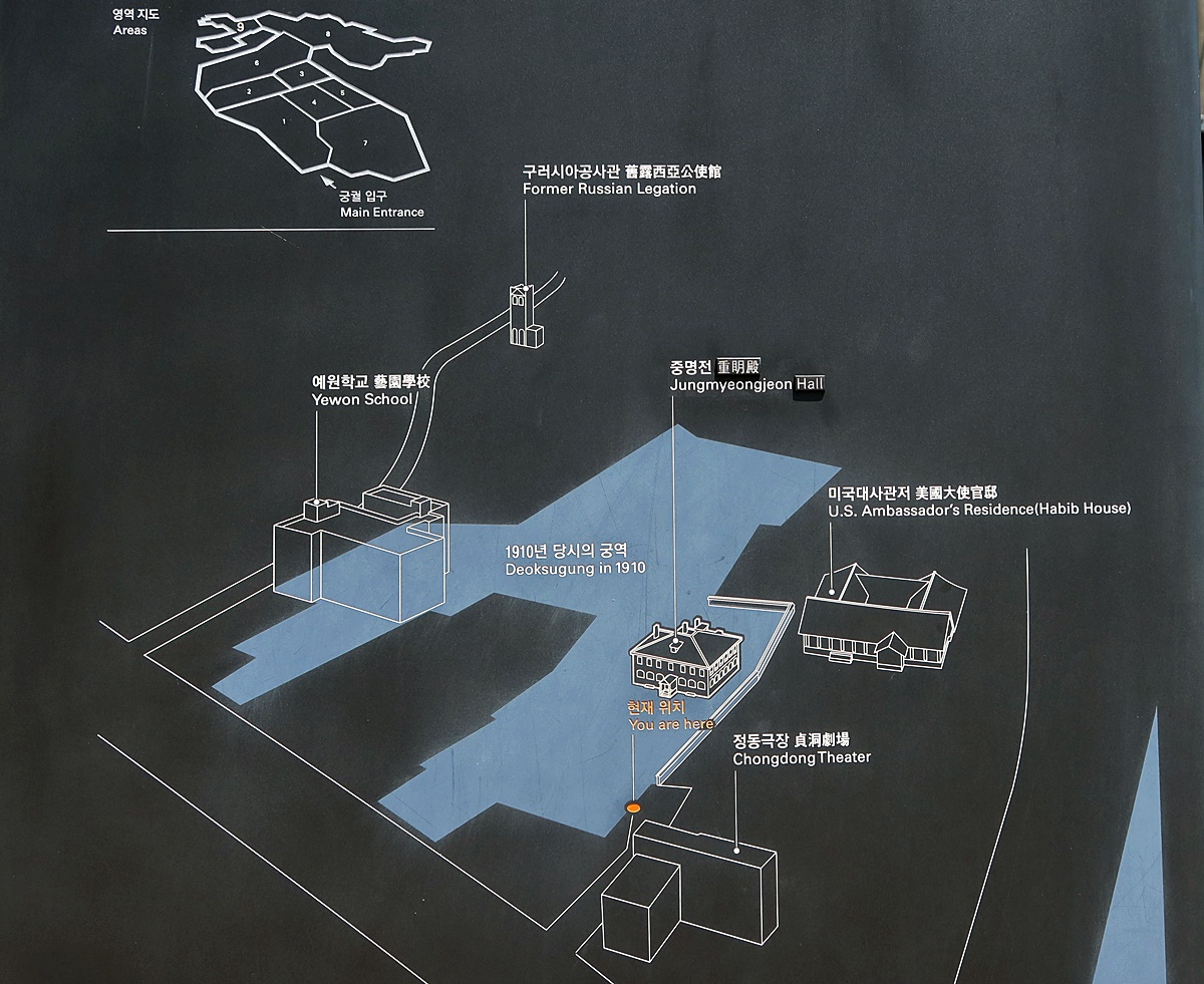 고종의 집무실이자 외국사절의 접견실로 사용되었던 중명전 (重明殿)과 일부 외교공관의 흔적이 남아 있어 한국 근대외교의 중심공간임을 실감할수 있다."