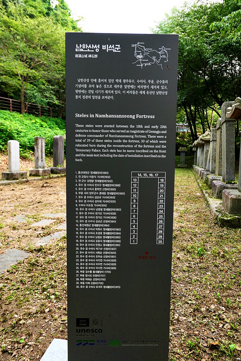 남문을 들어서면 길가에 8기, 그 아랫쪽에 30기를 모아둔 것이 보이며 이외에도 산성 안에는 비석들이 여럿 보이는데 조선 후기의 역대 광주유수, 수어사, 부윤, 군수들의 공덕을 기린 비석들이지요.