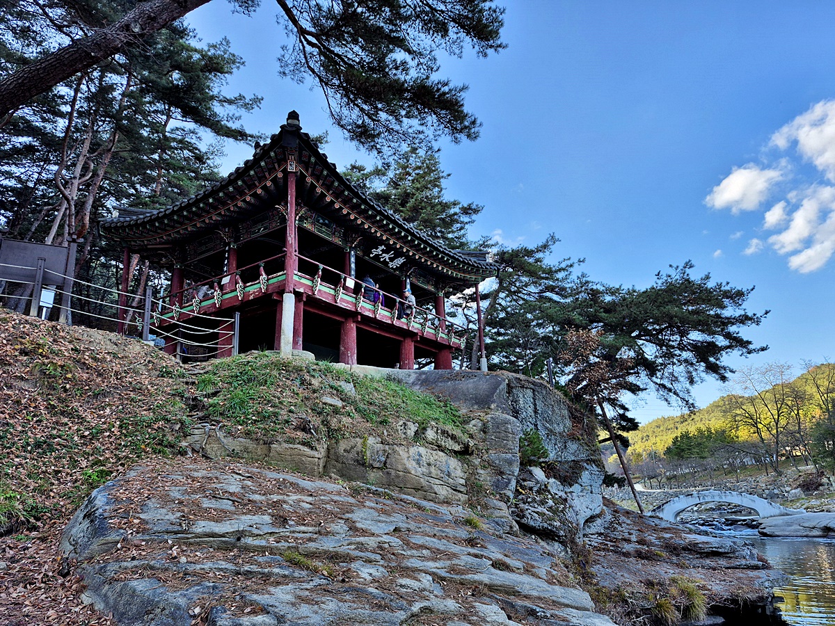 양쪽의 큰 바위에 의지하여 정면3칸 측면 2칸의 중층 겹처마 팔작지붕으로 지은 루각이 무척 신기하고 운치있는 모습