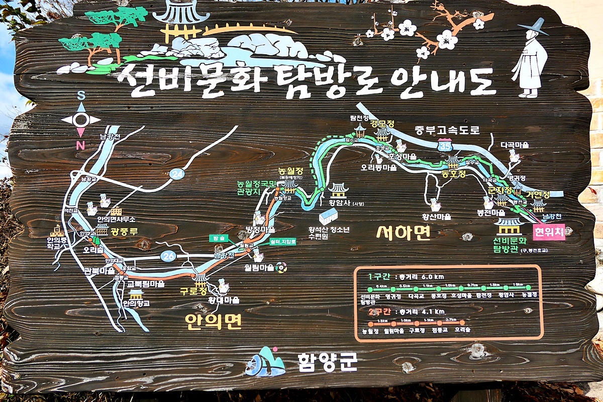 안내판을 보니 함양군 서하면, 안의면을 흐르는 금천을 따라 화림동계곡을 걷는 선비문화탐방로가 개설되었네요.