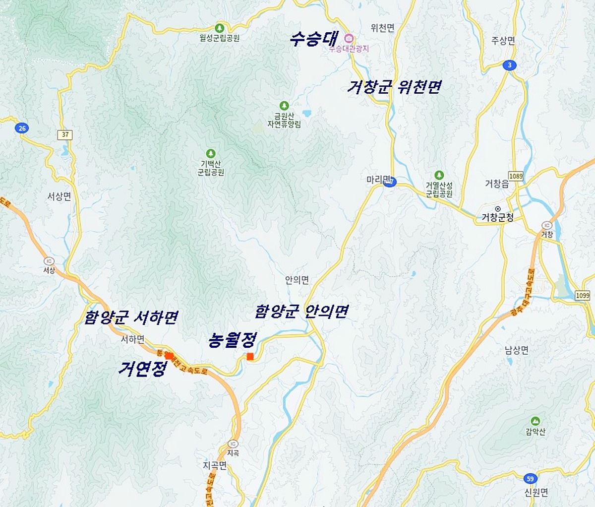 거연정은 함양군 서하면 봉전리 2006, 농월정은 함양군 안의면 농월정길 9-13, 수승대는 거창군 위천면 강천리 790.