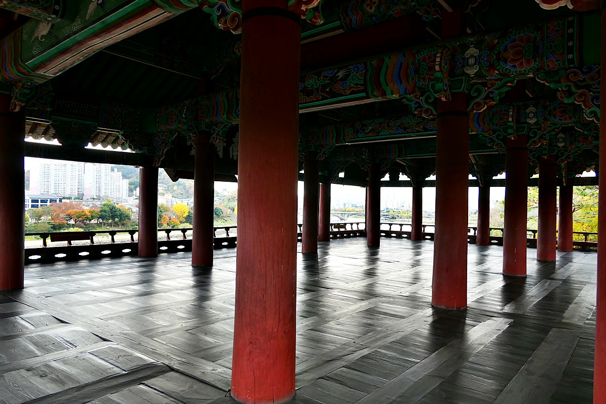 정면 5칸, 측면 4칸의 팔작지붕의 촉석루는 전시에는 지휘본부로 사용되었지만 평시에는 풍류를 즐기거나 향시를 치르는 고사장으로 사용되었다고.
