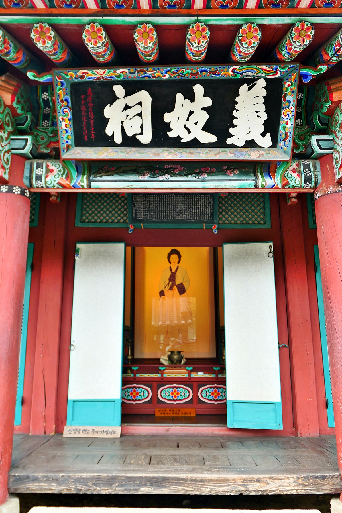 의기사는 논개의 영정과 위패를 모신 사당으로 영조 16년(1740) 처음 지어졌으나 지금의 건물은 1956년 다시 고쳐 지은 것이라고.