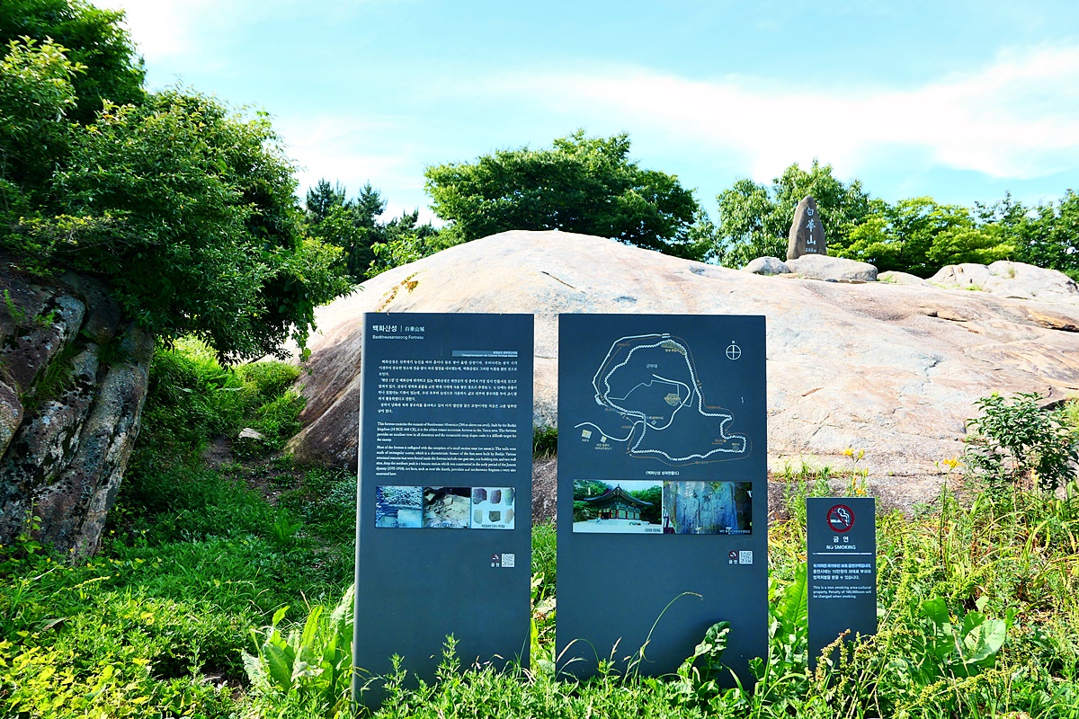 산 자체도 흰바위가 어울리는 멋진 산으로 정상부에는 마애삼존불과 백화산성, 봉수대터와 바위에 새긴 각자들을 감상할수 있을뿐만 아니라