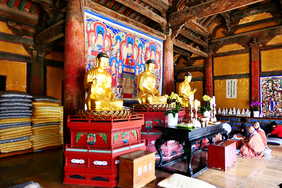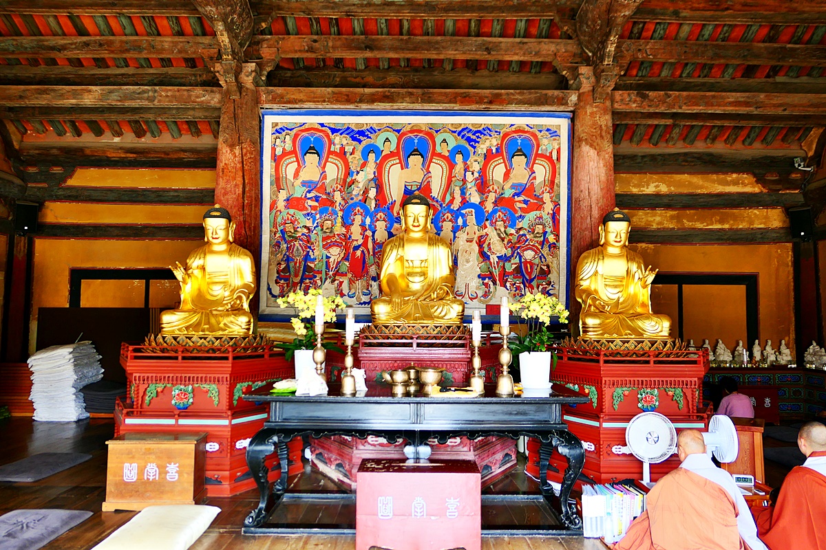 대웅전에 모셔진 목조삼세불좌상.