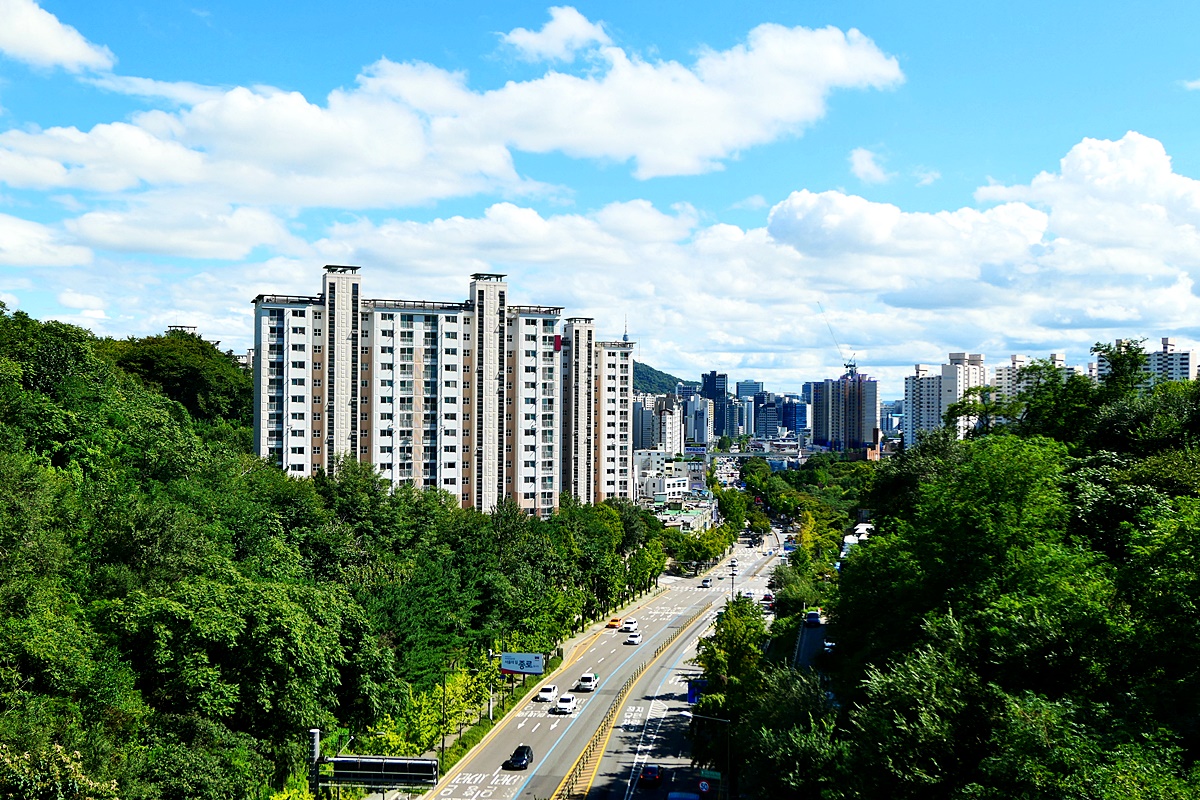 오름길에서 바라본 무악재하늘다리와 안산(295.9m).