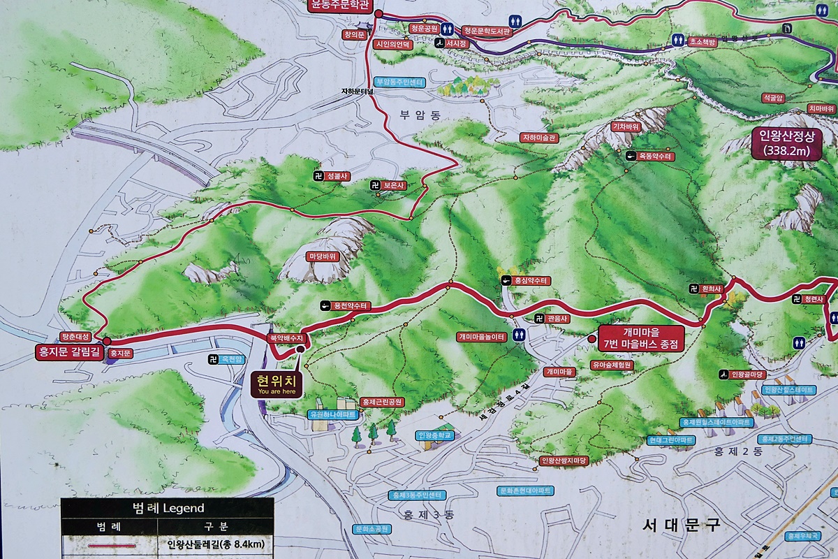 몇시간 동안 안산, 무악재, 인왕산을 걸어 이곳까지 왔습니다.