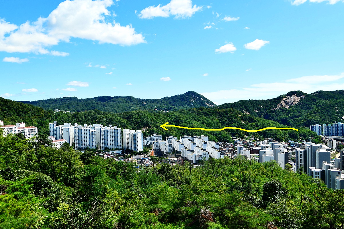 잠깐씩 조망이 트이며 홍은동 주택가를 바라보며 걷는 길.