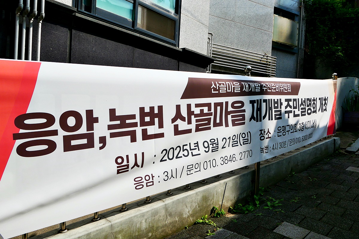 응암산골마을에 붙어있는 응암, 녹번 산골마을 재개발주민설명회 프래카드.