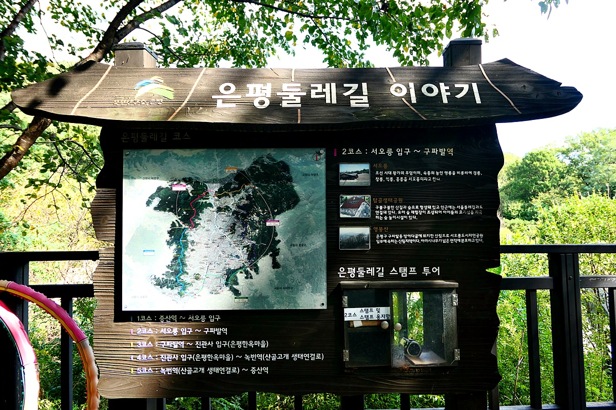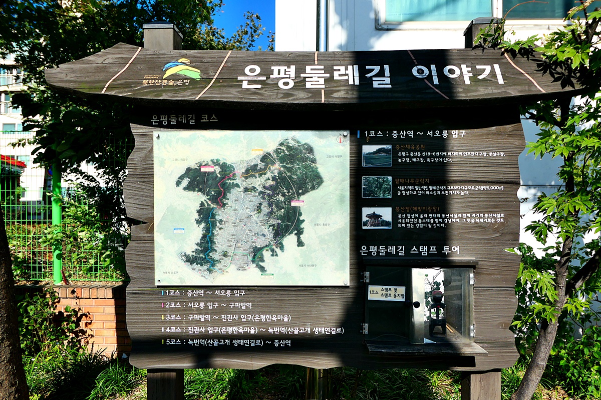 은평둘레길이야기 안내판에 수록된 5개 코스의 내용과 1코스 설명, 그리고 스탬프함.