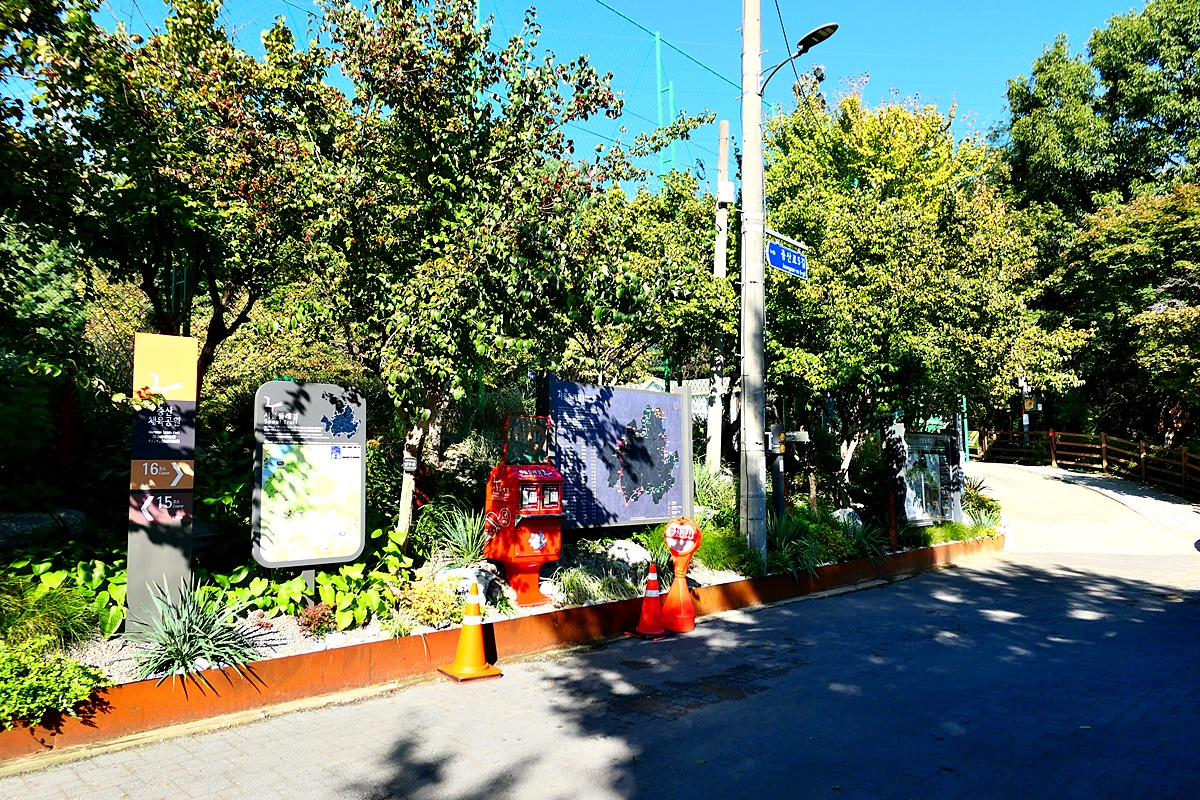 서울둘레길 안내판과 은평둘레길 안내판이 같이 있는 증산체육공원 앞.