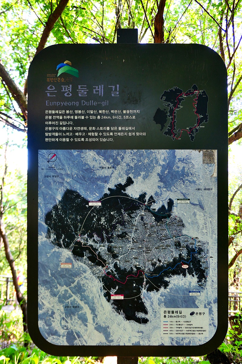 은평둘레길은 봉산, 앵봉산, 이말산, 북한산, 백련산, 불광천까지 은평구 전역을 하루에 둘러볼수 있는 총 24km, 9시간, 5코스로 이루어진 길이라는 설명.