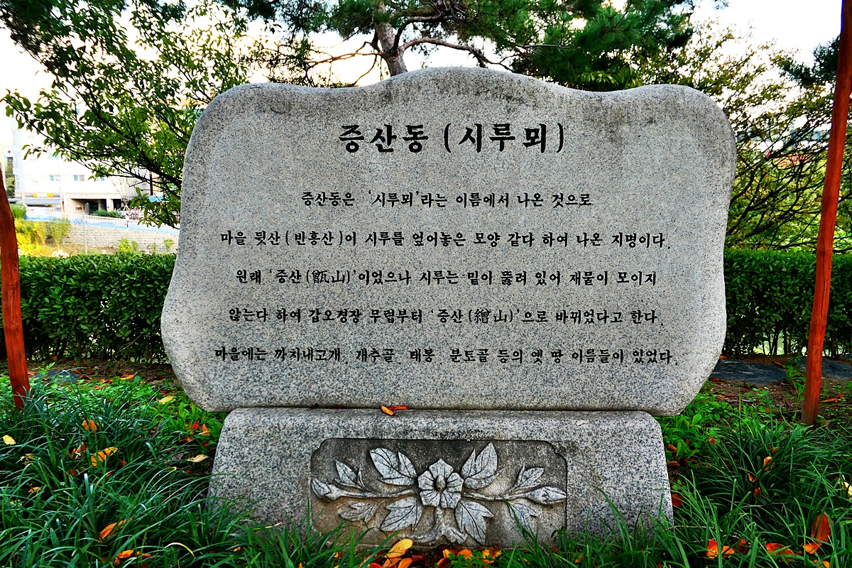 "증산동은 시루뫼라는 이름에서 나온 것으로 마을 뒷산인 빈홍산이 시루를 엎어놓은 모양과 같다하여 나온 지명이다.