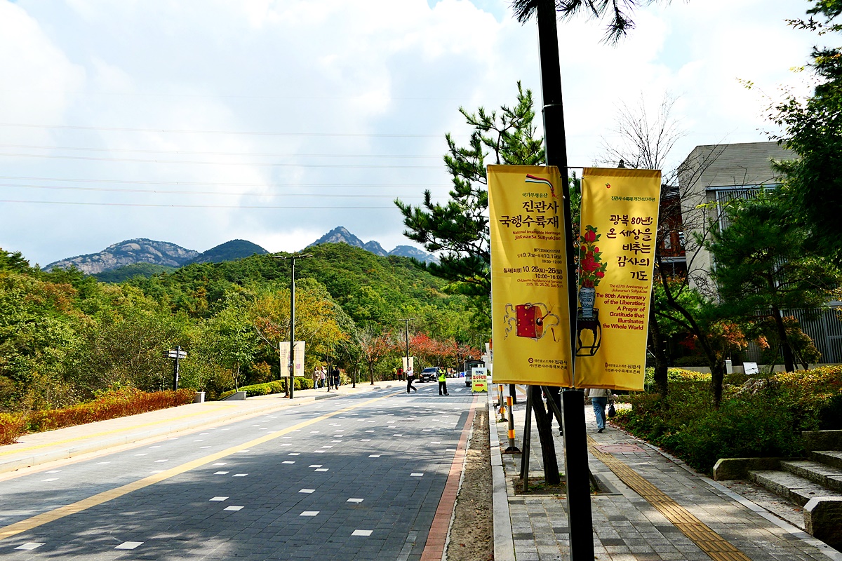 진관사 국행수륙대재가 있음을 알리는 배너가 걸려 있는 백초월 길.