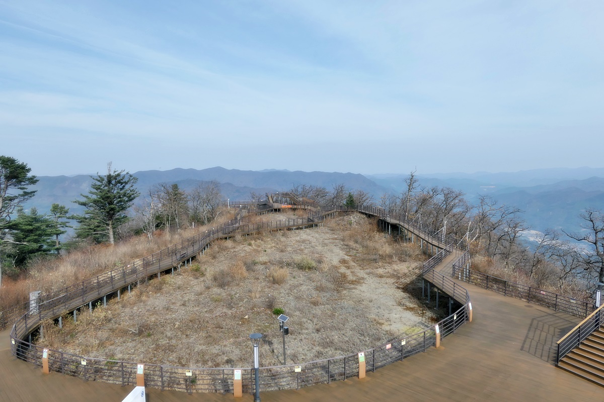 정상부는 사방으로 조망이 가능하도록 둥그렇게 데크를 깔고 가운데는 생태보호를 위해 비워둔 상태.