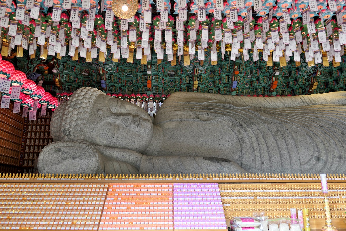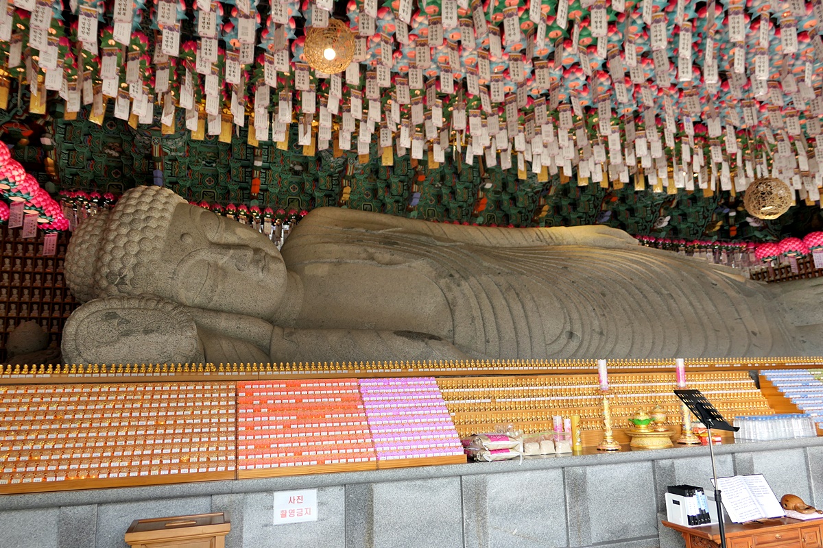 와불전 안에 모신 와불을 뵈니 전체 신장이 13.5m, 높이 2m나 되는 큰 규모였는데 1980년에 조성을 시작하여 2009년에 완료되어 안치했다고 하며 넘 인자스러운 모습으로 주위를 돌면서 참배하기에 알맞게 조성되었습니다.