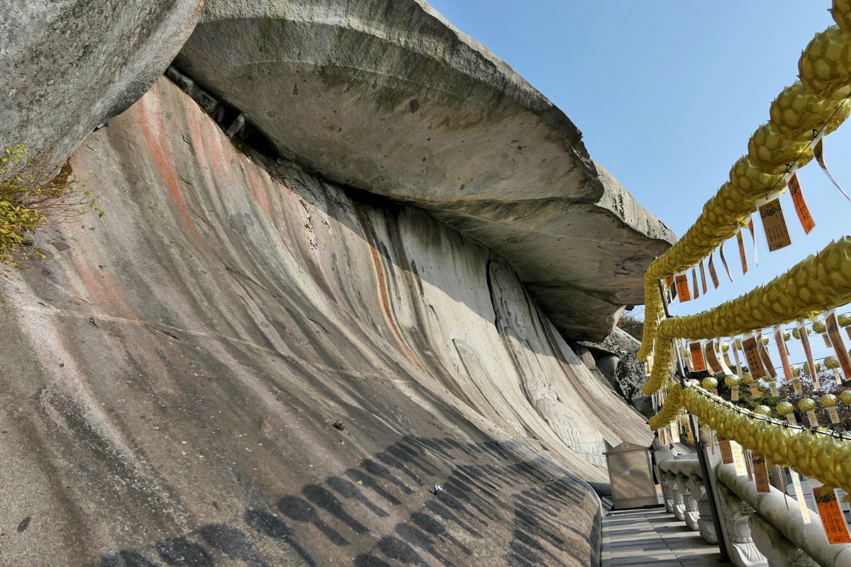 이 절은 암벽의 동굴 안에 조성한 석실, 눈썹바위에 조성한 관세음보살상, 넓은 천인대가 유명하지요.
