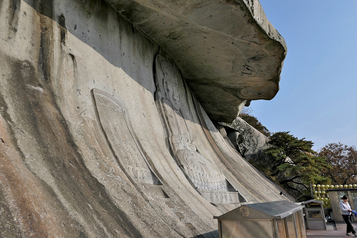 1928년에 암각되어 연륜은 길지않지만 거대한 눈썹바위에 자비로운 미소를 간직한 모습으로 앉아있는 모습이 너무나 극적이며 이곳에서 바라보는 서해바다는 물론 석양의 붉은 노을은 정말 무아지경에 빠지게 하지요.