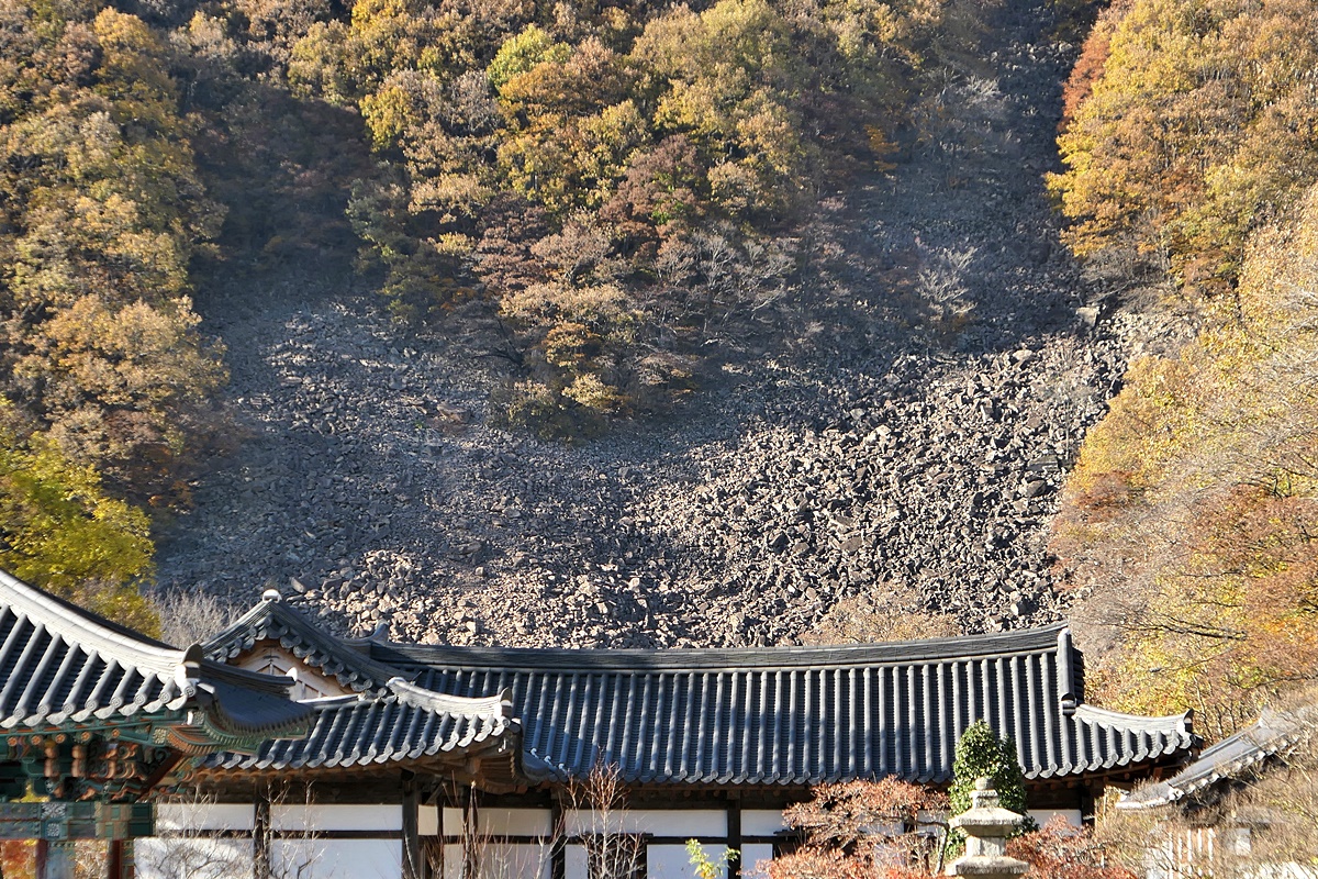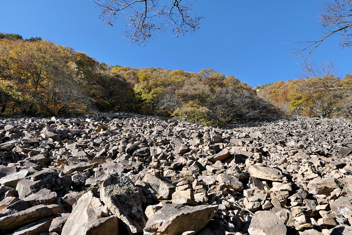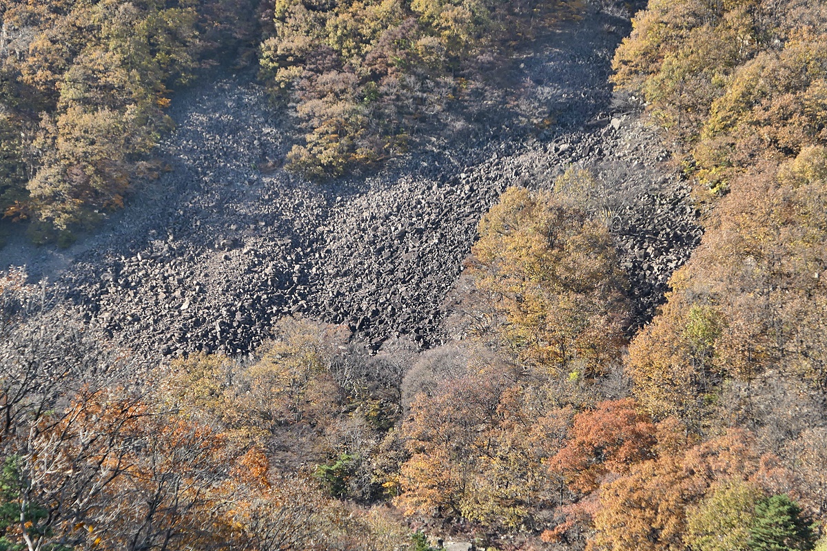 하천을 향해 끝없이 쌓여있는 돌무더기 너덜지대.