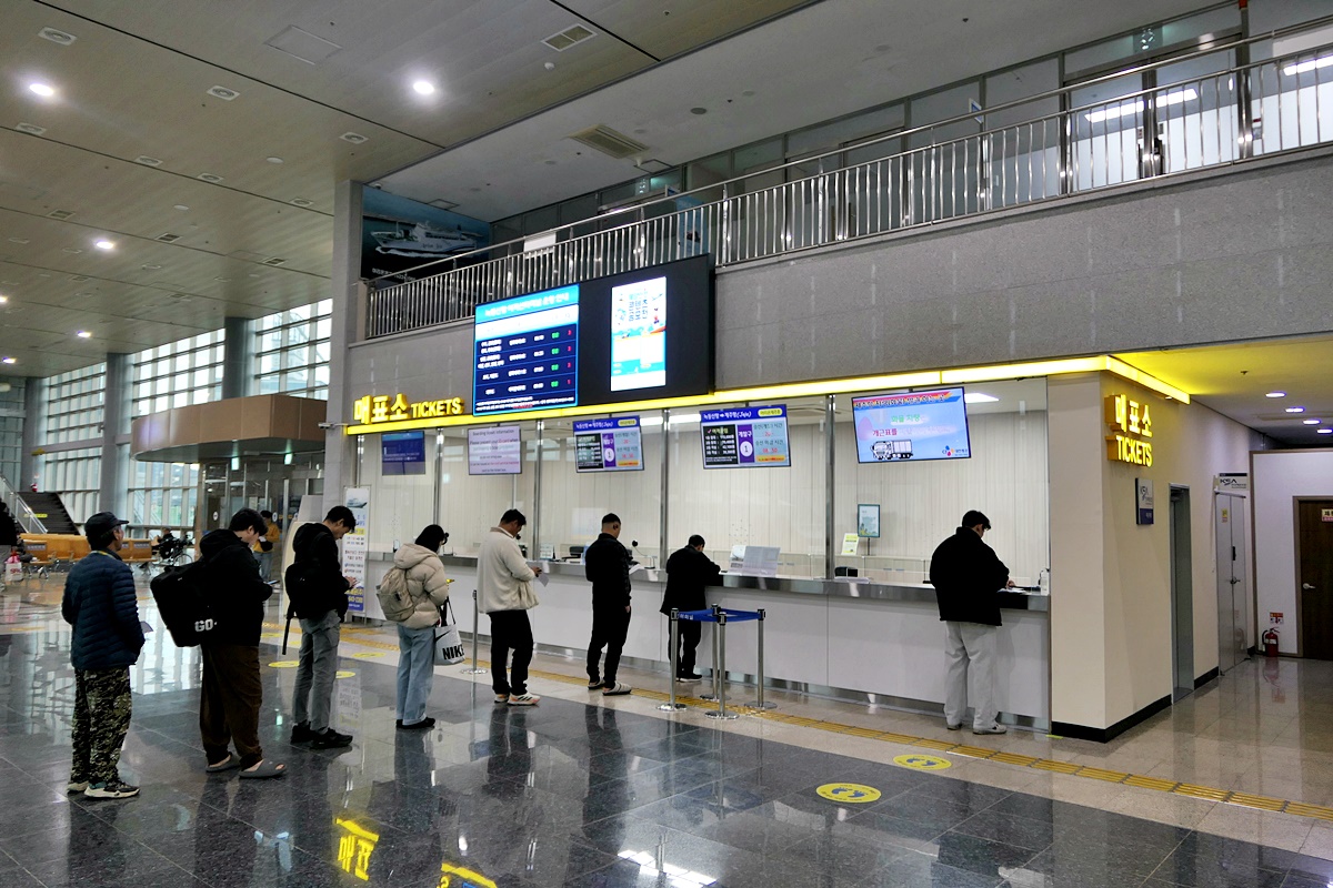 09:00 제주도행 배를 타기 위해 녹동신항 매표소에서 발권을 기다리는 모습.