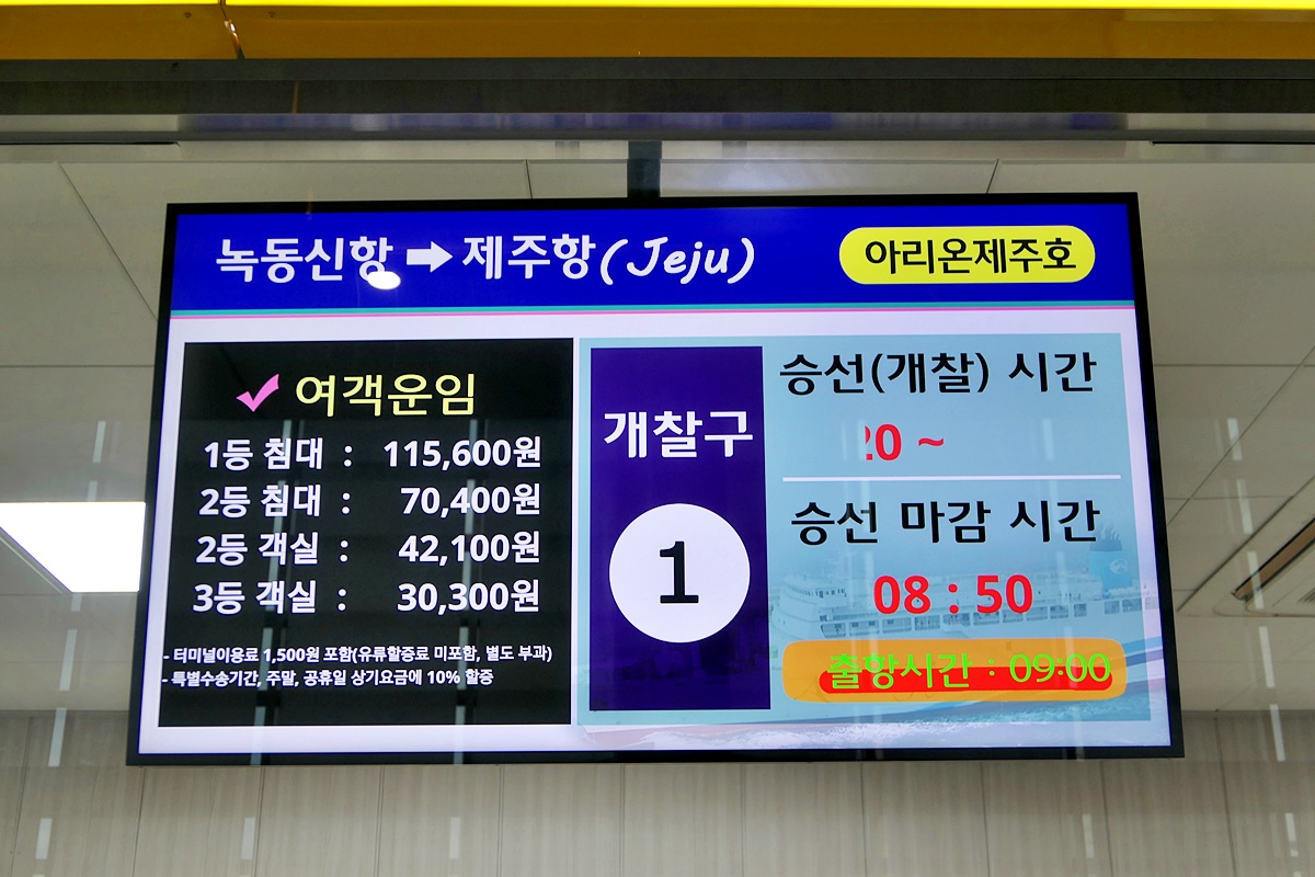 녹동신항에서 제주항까지는 3시간 40분이 소요되며, 운임은 3등 객실은 30,300원이니 저렴한 편.