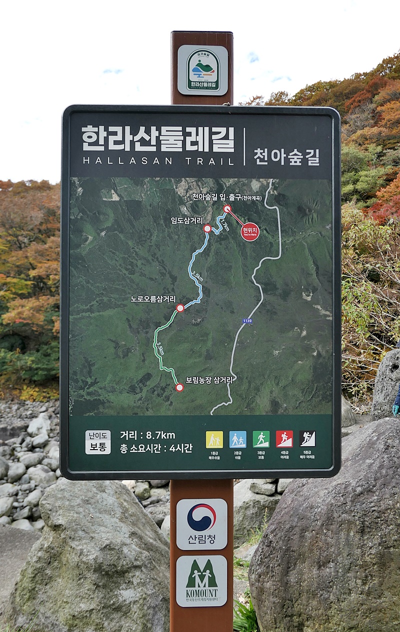 천아숲길은 천아계곡~임도삼거리~노로오름 삼거리~보림농장 삼거리까지 8.7km로 한라산 원시림을 가장 잘 볼수 있는 구간이지요.