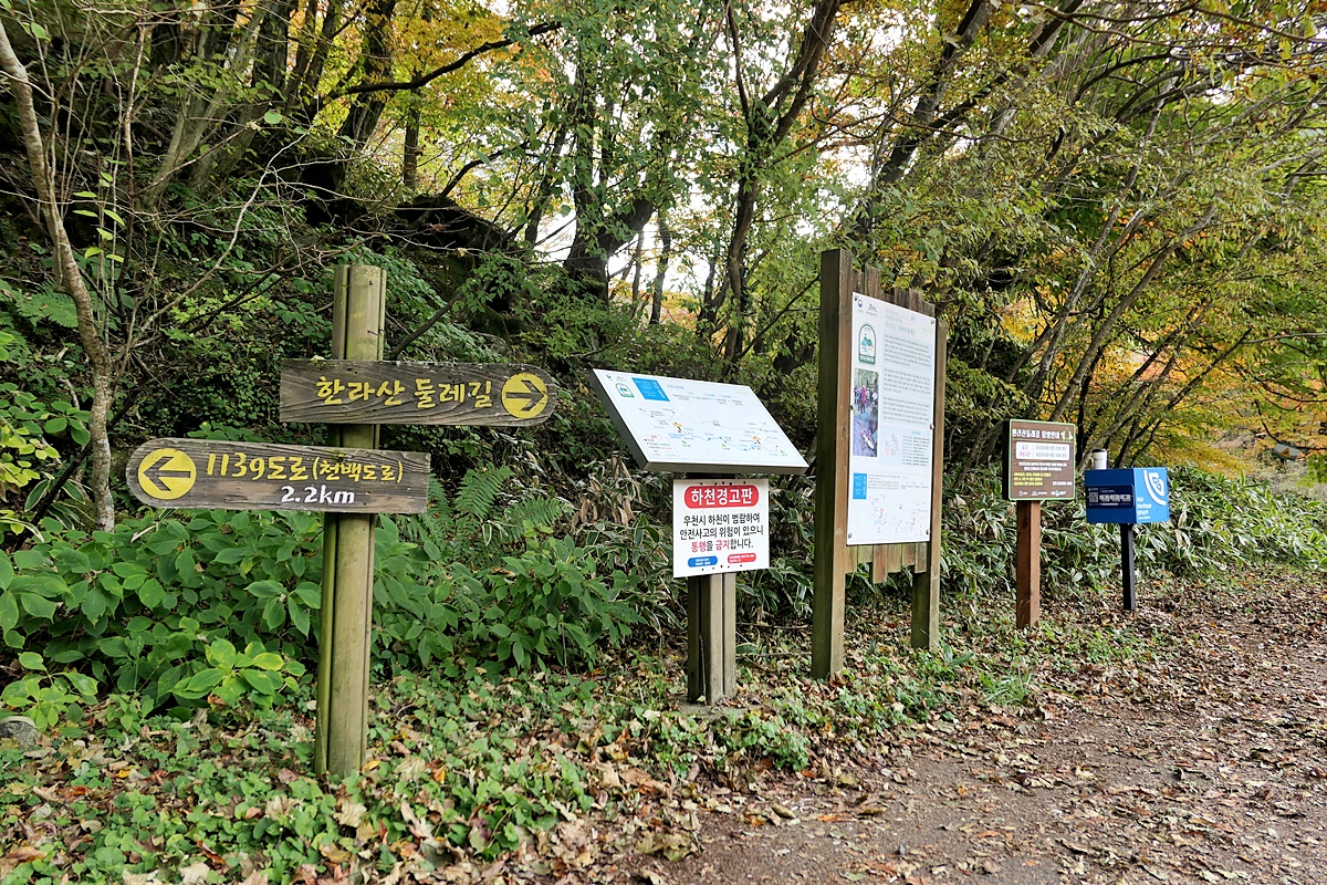 1139도로(1100도로)에서 2.2km 떨어져 있고 한라산둘레길로 가는 방향을 가리키네요.