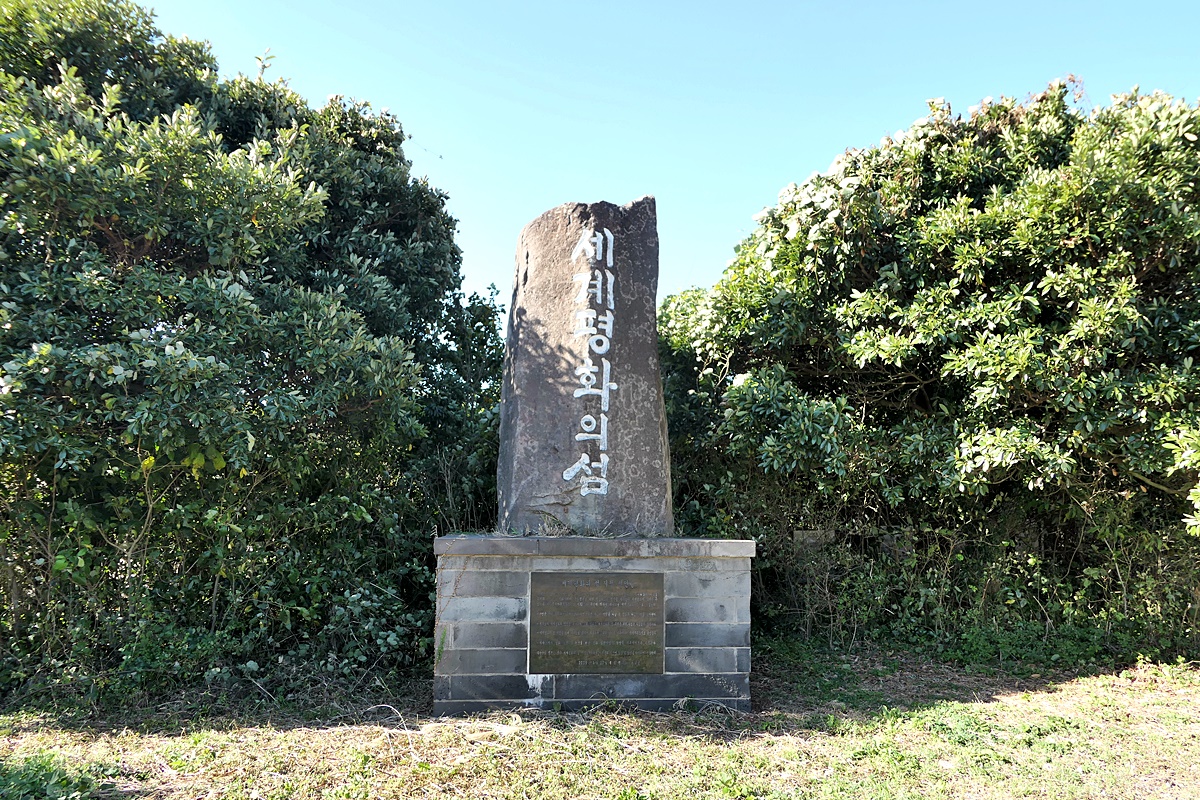 "세계평화의 섬"이라는 표석이 서있는 제주평화박물관 경내.