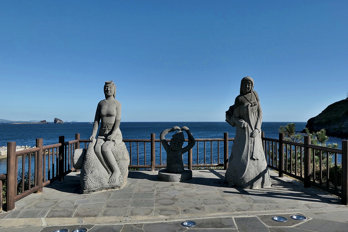 관광객을 반겨주는 송악산 오름 입구의 해녀상.