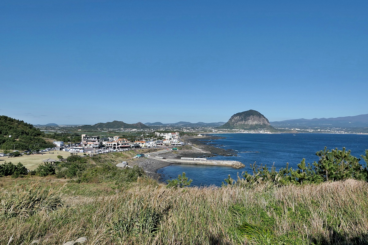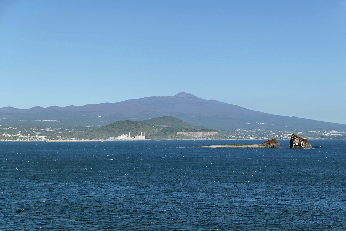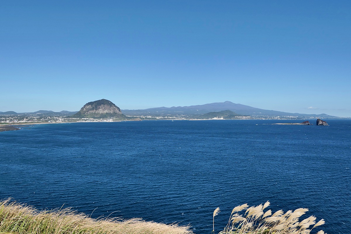 오호, 제주의 푸른 바다 위에 떠있는듯한 산방산과 멀리 한라산까지 일망무제.