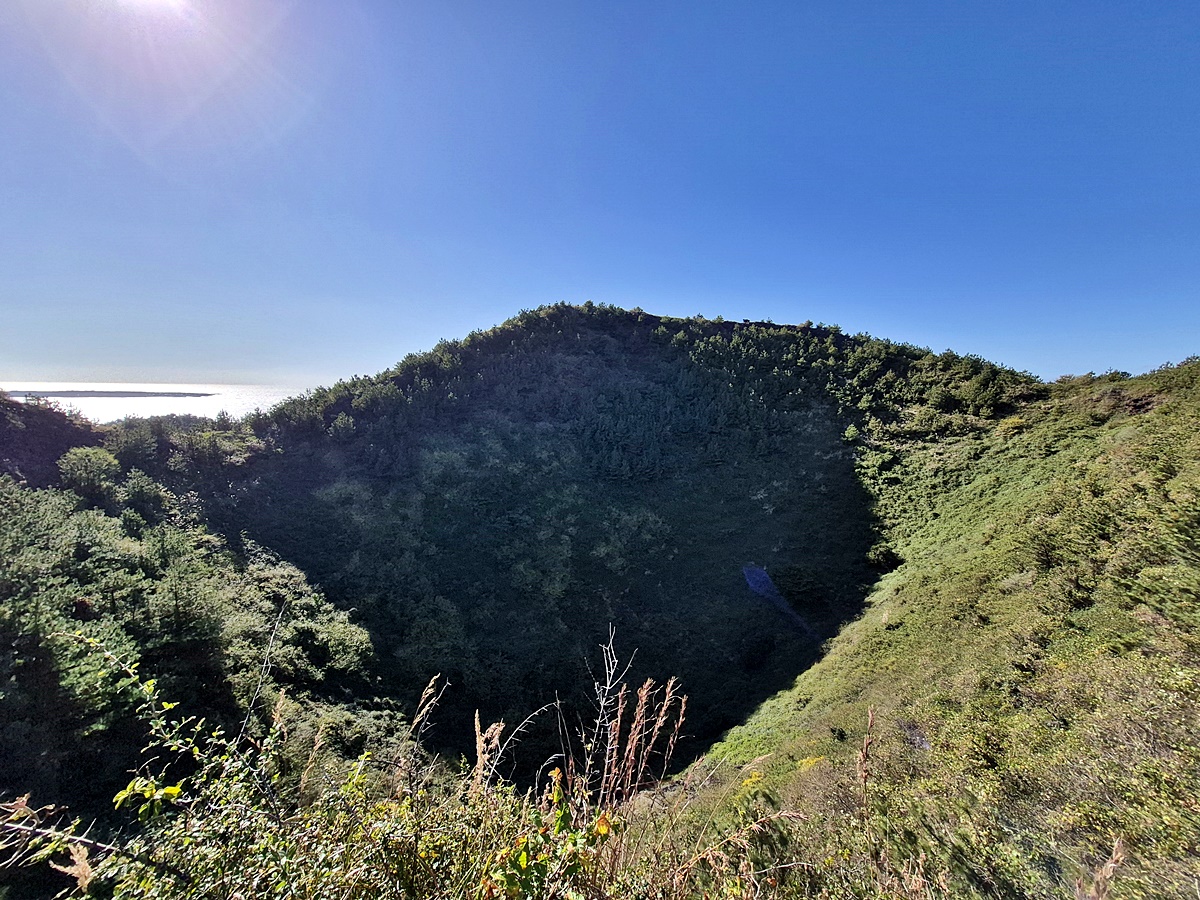 오호, 송악산 분화구 뒤로 마라도, 가파도까지 보입니다.