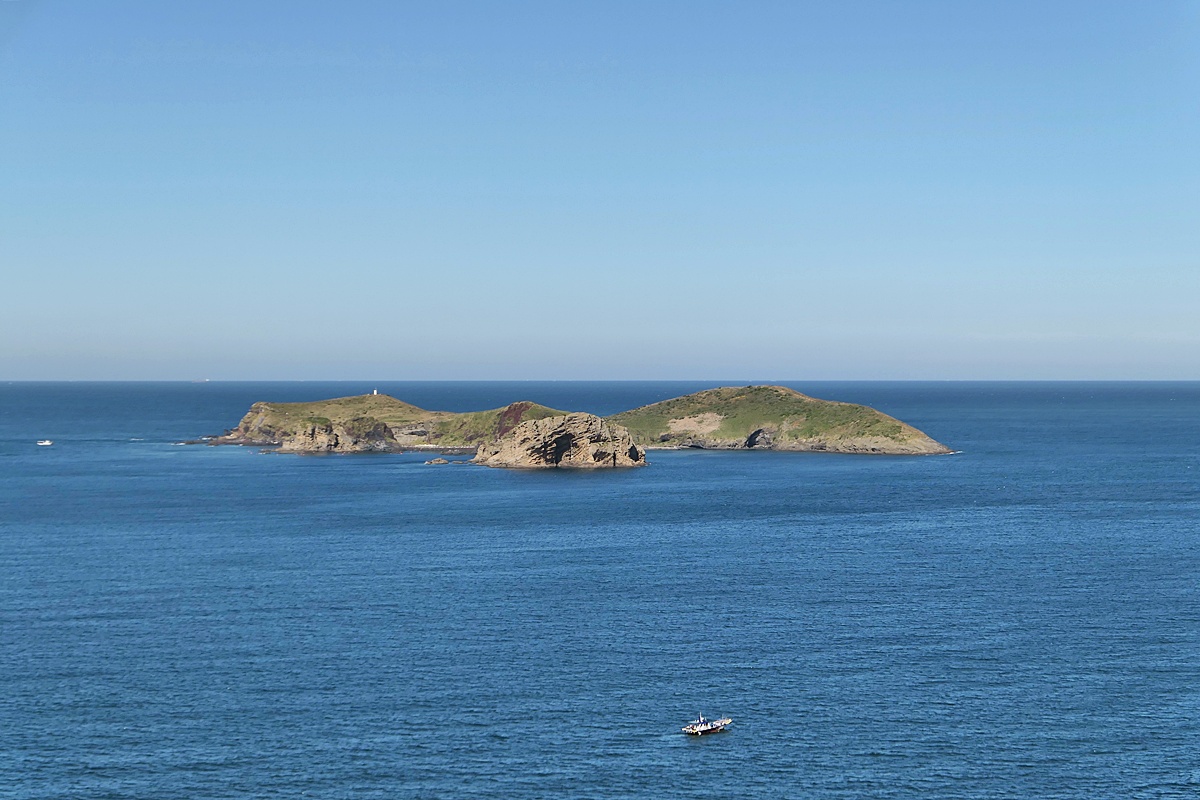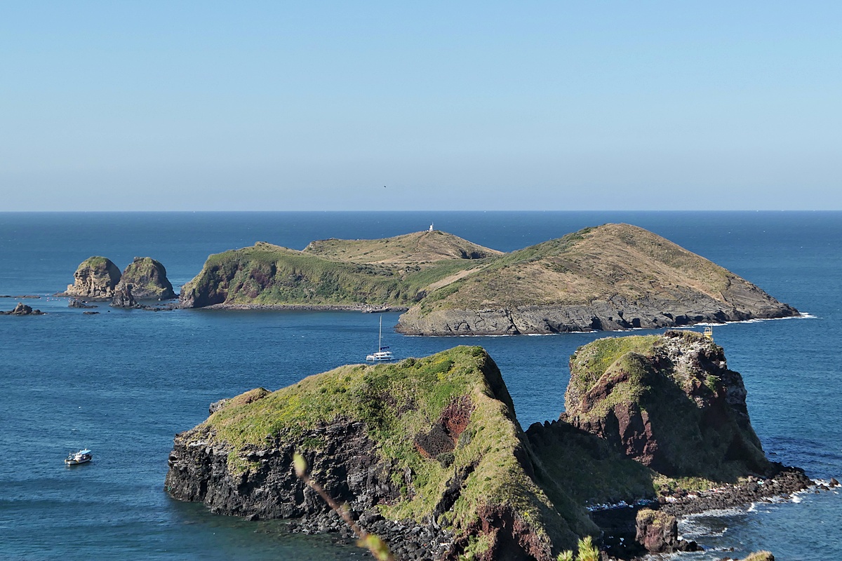 수월봉에서 바라보이는 차귀도의 본섬인 죽도와 와도, 지실이섬(독수리바위).