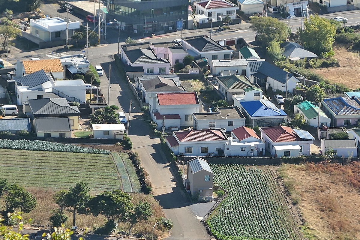 당산봉에서 내려다 본 한경면 고산리의 예쁜 농가들.
