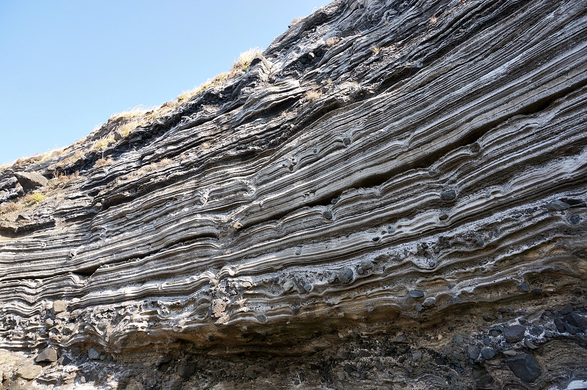 수월봉이 형성된 후 파도가 수성화산체(응회환)의 화산재층을 깎아 절단면을 만들어 놓았는데 특히 지층이 휘어져 있는 탄낭구조는 수월봉의 가장 큰 특징입니다.