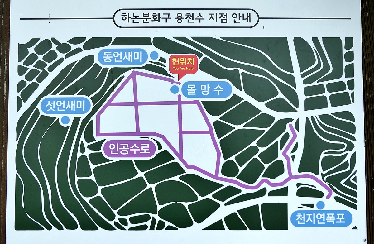 논으로 흘러간 물은 분화구에서 가장 낮은 남쪽 화구벽의 수로를 통해 분화구외부로 나가 천지연폭포로 이어집니다.