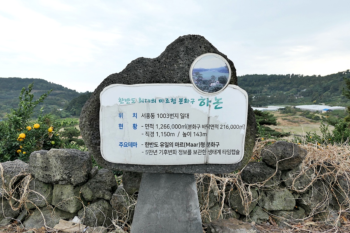 하논분화구는 우리나라 최대의 화산분화구로 칼데라 지형이며 한반도 유일의 마르(maar)형 분화구로 학술적 가치가 높습니다.