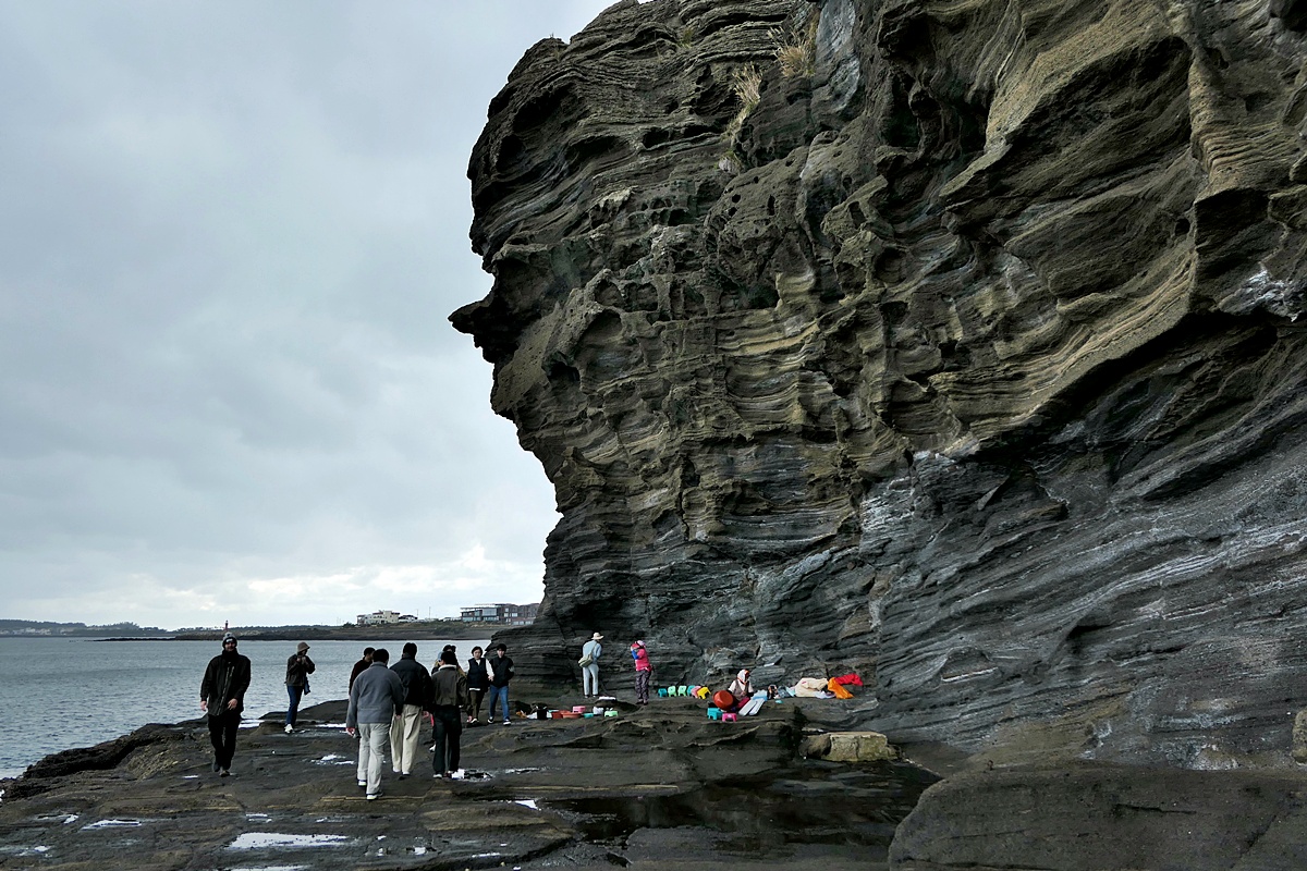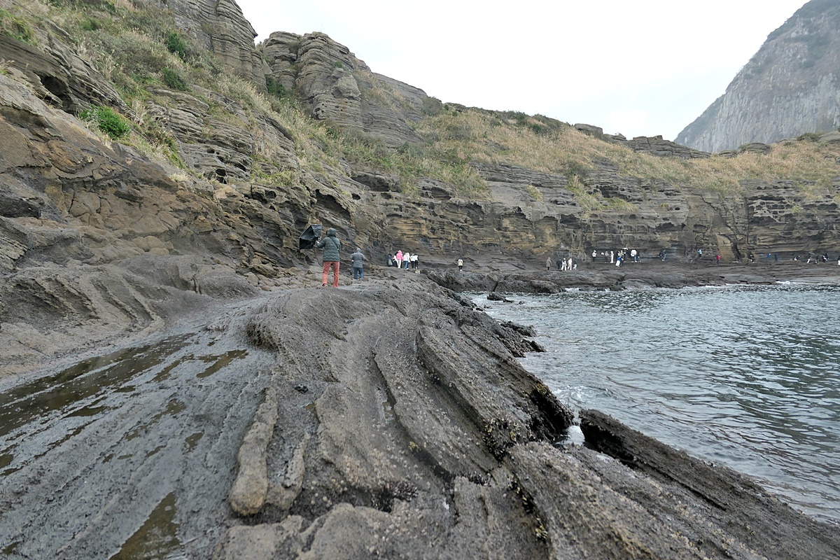 180만년전 마그마가 물과 만나 푹발적인 분화를 일으키는 수성 화산활동으로 만들어진 용머리 화산체가 다시 수만년 동안 침식작용과 풍화작용으로 길이 700m, 높이 25~40m의 해식애 절경을 만들고 있는거지요.