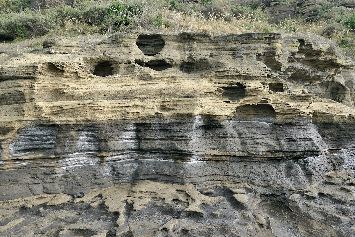 겹겹이 쌓인 지층이 장관을 이루는 모습.